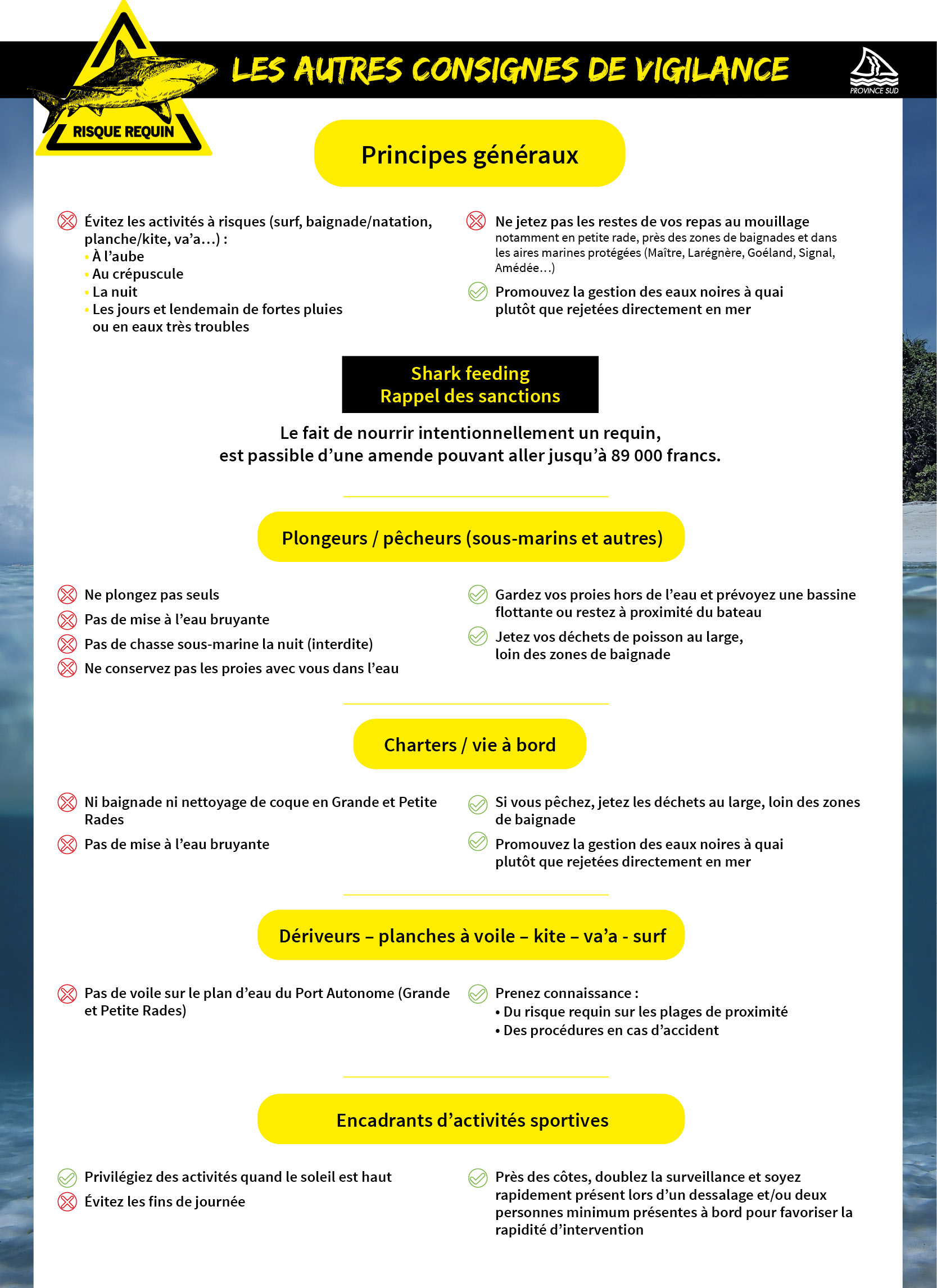 Néanmoins, chaque usager de la mer, qu’il soit plaisancier, pêcheur, surfeur, véliplanchiste, kiter, kayakiste ou même chasseur sous-marin ainsi que chaque personne effectuant une activité en lien ou à proximité du lagon peut contribuer à la prévention du risque requin.