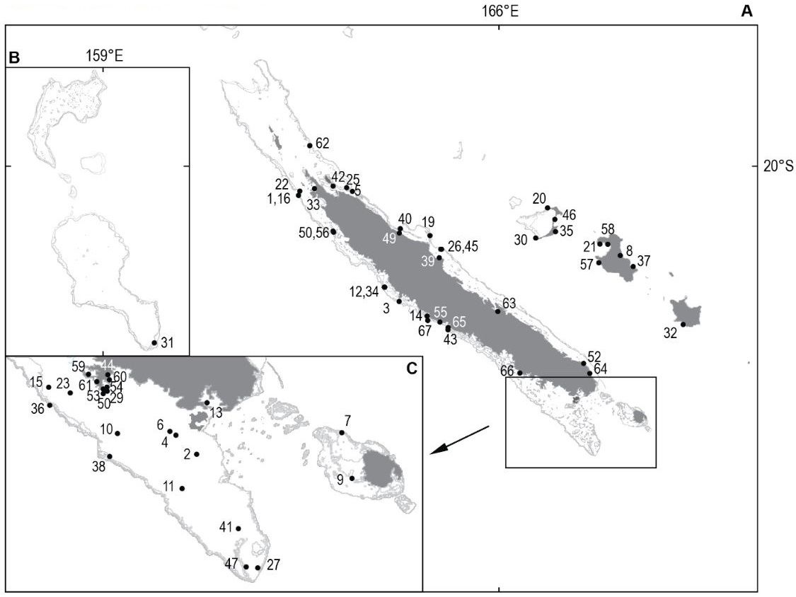 A - Nouvelle-Calédonie et Îles Loyauté. B - Atolls Chesterfield-Bampton et Bellona. C - Agrandissement du lagon sud de la Nouvelle-Calédonie.